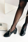 Does autumn bring out your preppy side? These smart, black patent leather, block heeled loafers with a chain link trim are perfect for dressing up your work wear, or a smart-casual Sunday brunch.