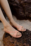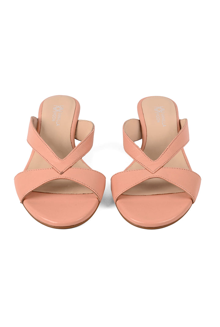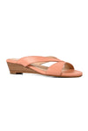 Sleek and elevated, this peach slip-on sandal features a slim, leather-veneer-covered wedge. A rounded toe keeps the silhouette soft, blending effortless style with subtle height. Perfect for everyday polish with a touch of lift.