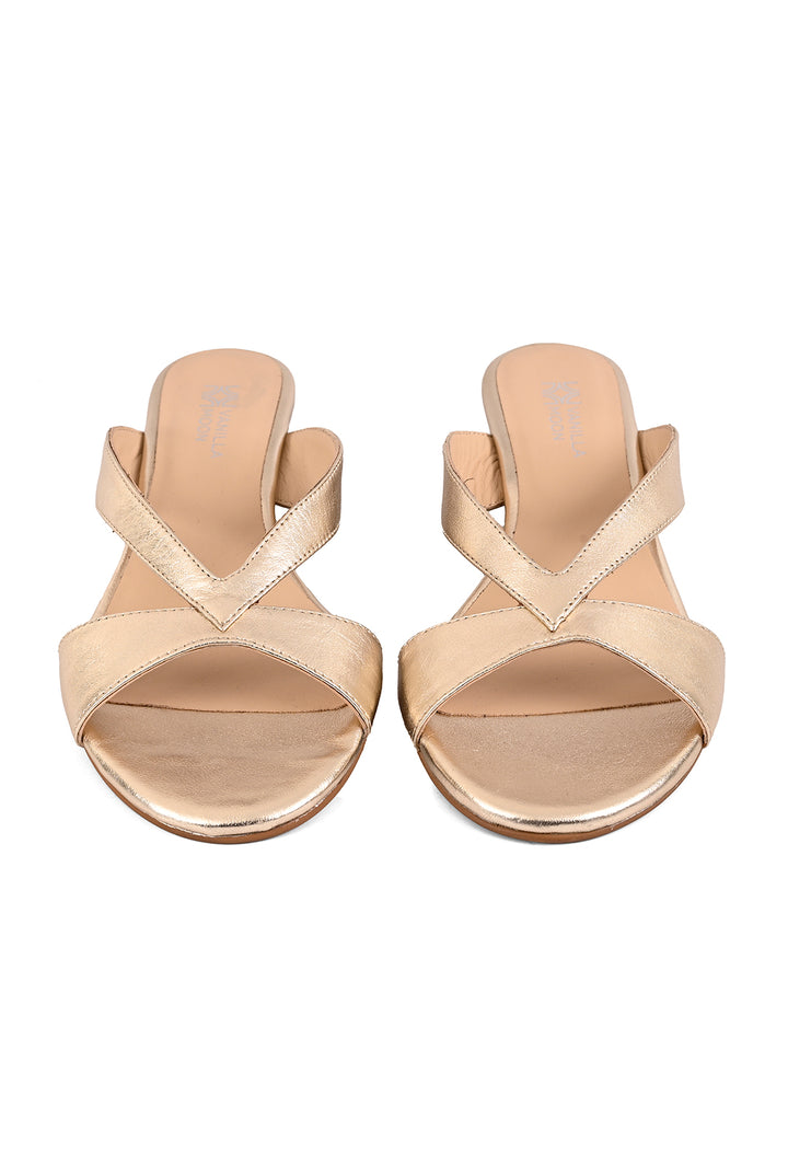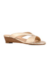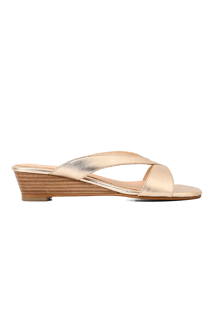 Sleek and elevated, this gold slip-on sandal features a slim, leather-veneer-covered wedge. A rounded toe keeps the silhouette soft, blending effortless style with subtle height. Perfect for everyday polish with a touch of lift.