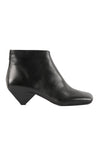 Sculptural in silhouette, refined in detail. This low ankle boot is sock-inspired; crafted in a glove construction with a waterproof back-zip and bold center seam. The asymmetric square toe pairs with a high-gloss cone heel that mirrors the polished upper, while an anti-skid inserted-rubber leather sole grounds the look. A modern JVAM essential with edge.