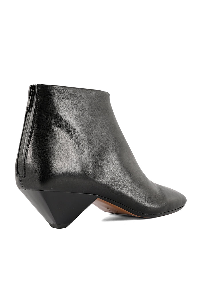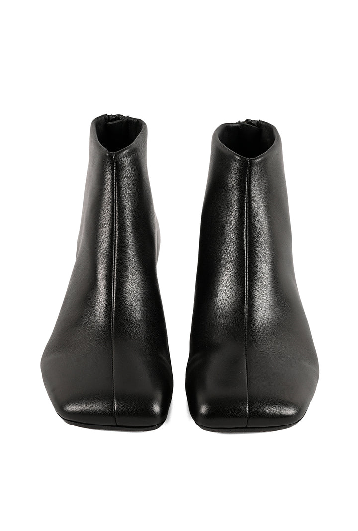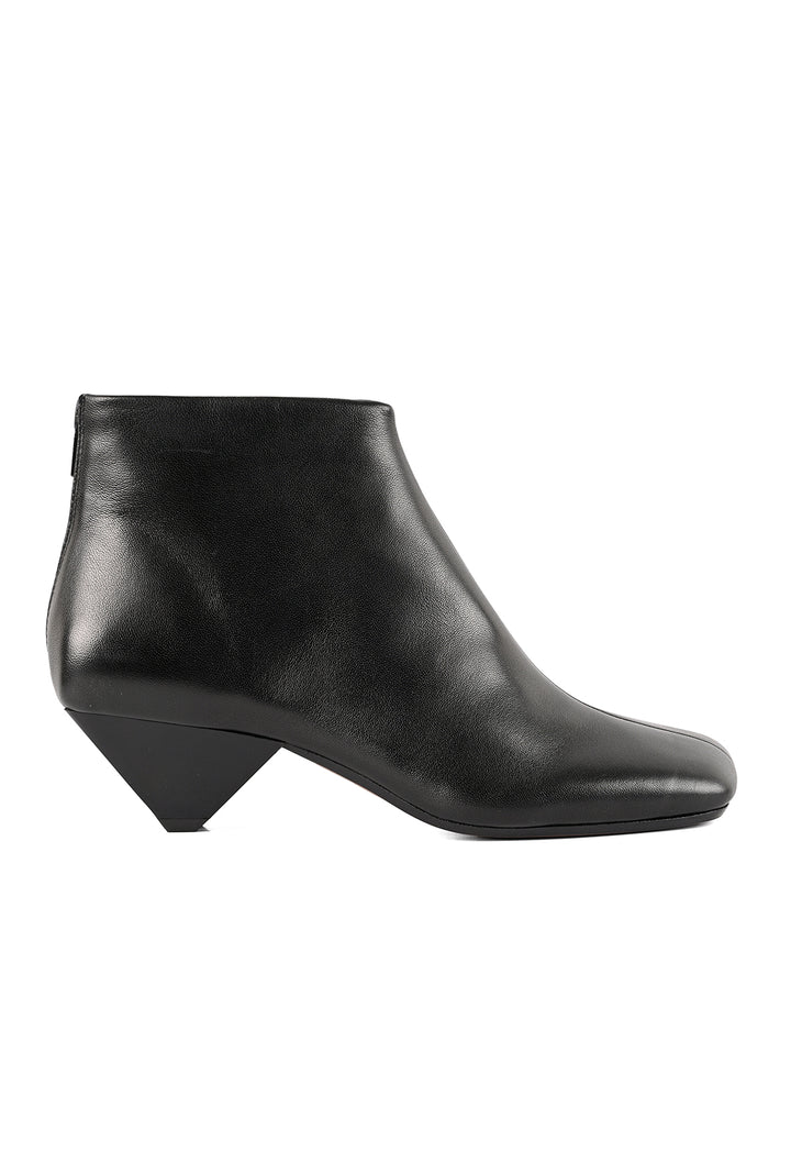 Sculptural in silhouette, refined in detail. This black, low-ankle boot is sock-inspired; crafted in a glove construction with a waterproof back-zip and bold center seam. The asymmetric square toe pairs with a high-gloss cone heel that mirrors the polished upper, while an anti-skid inserted-rubber leather sole grounds the look. A modern JVAM essential with edge.