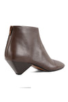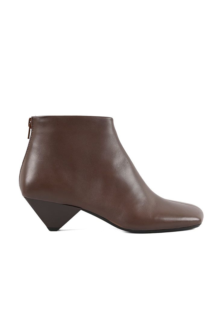 Sculptural in silhouette, refined in detail. This brown, low-ankle boot is sock-inspired; crafted in glove construction with a waterproof back-zip and bold center seam. The asymmetric square toe pairs with a high-gloss cone heel that mirrors the polished upper, while an anti-skid inserted-rubber leather sole grounds the look. A modern JVAM essential with edge.