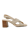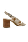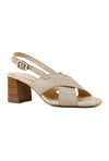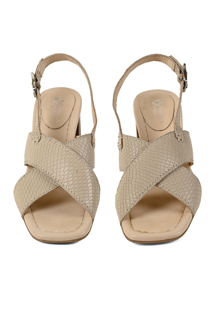 A mix of texture and structure. This beige printed leather sandal features a veneer-covered block heel and a square toe, with cross-strap upper and hand-stitch detailing. A backstrap with silver buckle and padded sock with self-stitching adds support and comfort for all-day wear.