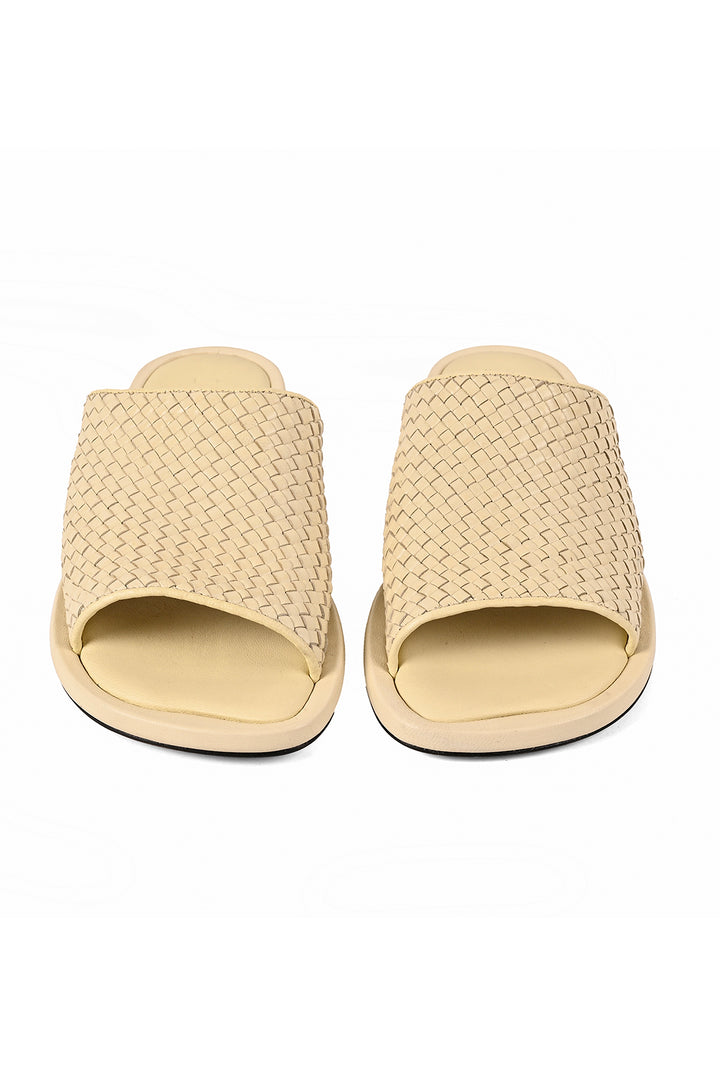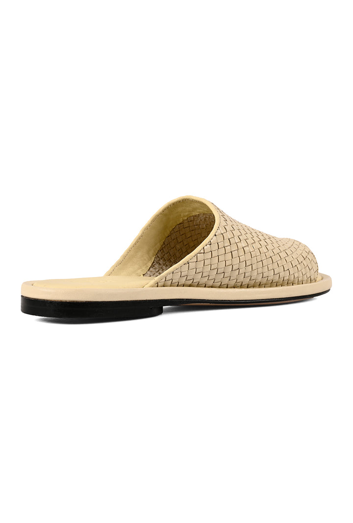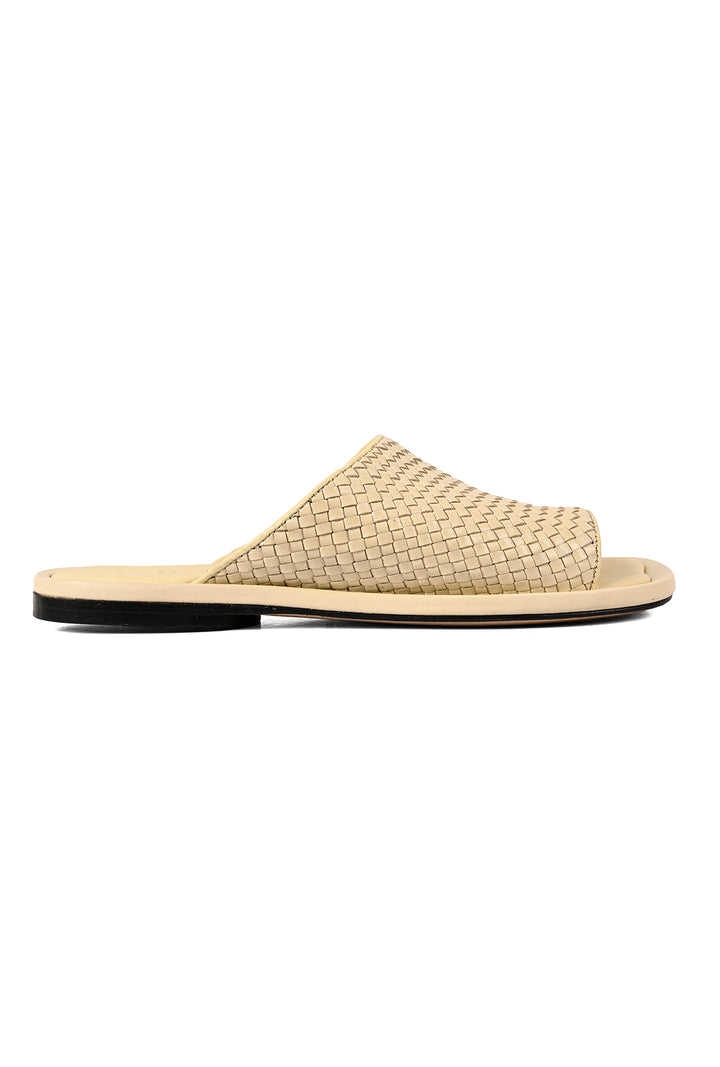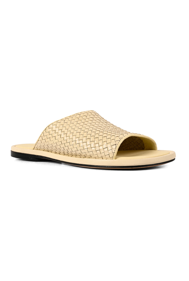 Where texture meets form. These ivory basket weave flat sliders feature a clean square toe and a padded inset insole for comfort. Finished with a leather sole, they bring understated JVAM style to everyday dressing.
