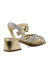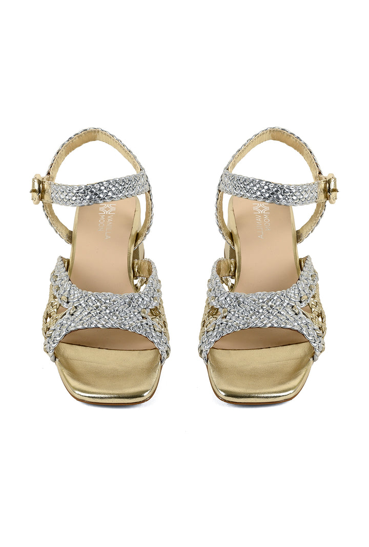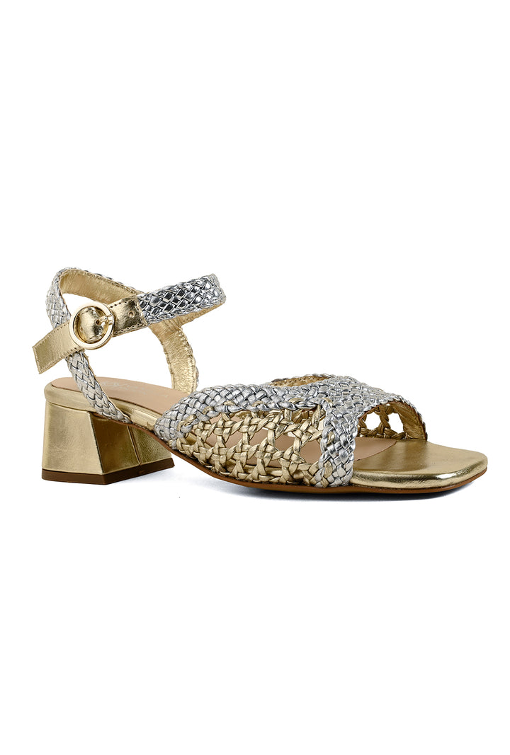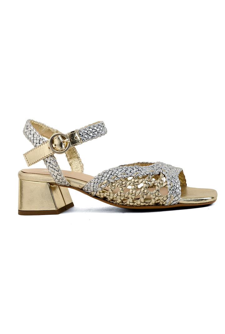 Step into a new era of chic! These gold and silver metallic handwoven sandals bring playful texture with a braided backstrap and a chic square toe, while a flared leather-covered heel adds just the right lift for all-day ease.