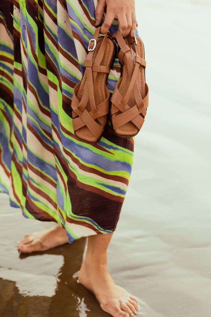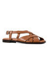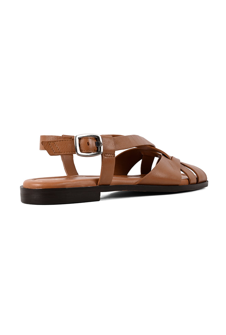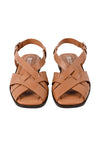 Clean lines with a modern finish. This tan square-toe sandal features a criss-cross upper and a secure backstrap, finished with a sleek silver buckle. A padded sock with self-stitch detailing adds comfort while keeping the look sharp and versatile.