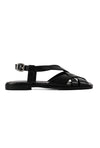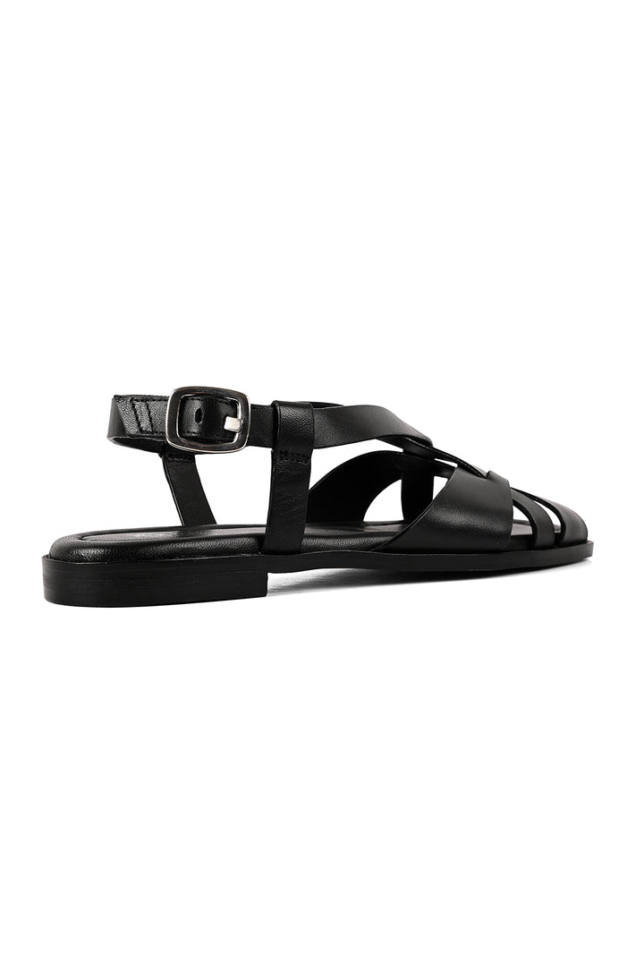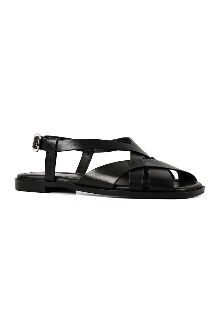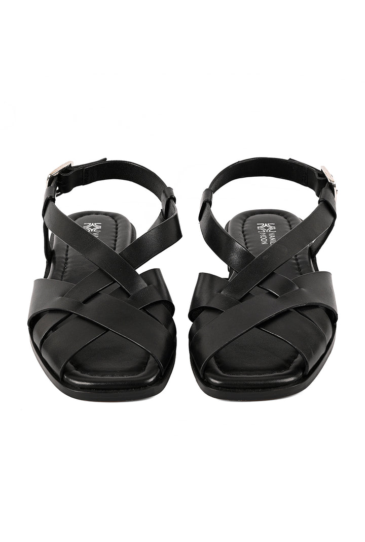 Clean lines with a modern finish. This black square-toe sandal features a criss-cross upper and a secure backstrap, finished with a sleek silver buckle. A padded sock with self-stitch detailing adds comfort while keeping the look sharp and versatile.