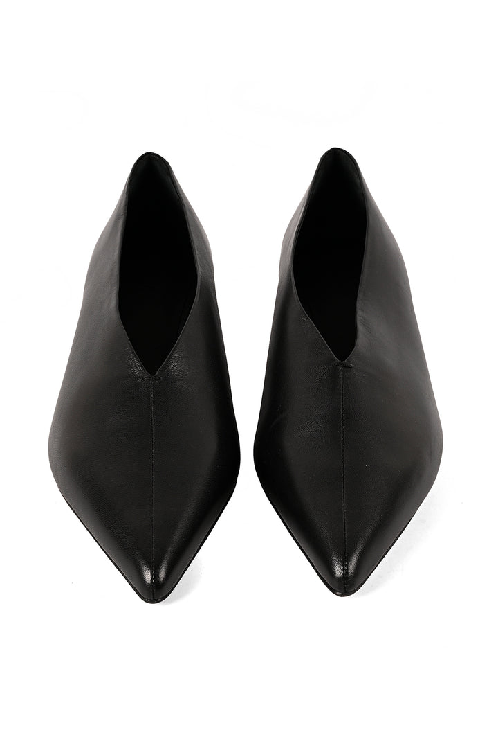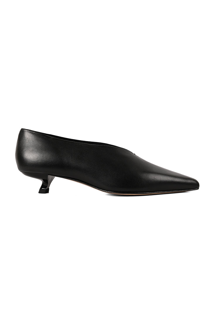 Clean, sharp, and quietly confident. This pointed closed-toe black coloured court shoe is set on a kitten heel, detailed with a central seam for subtle definition. Finished with a leather sole, it’s signature JVAM style with modern restraint.