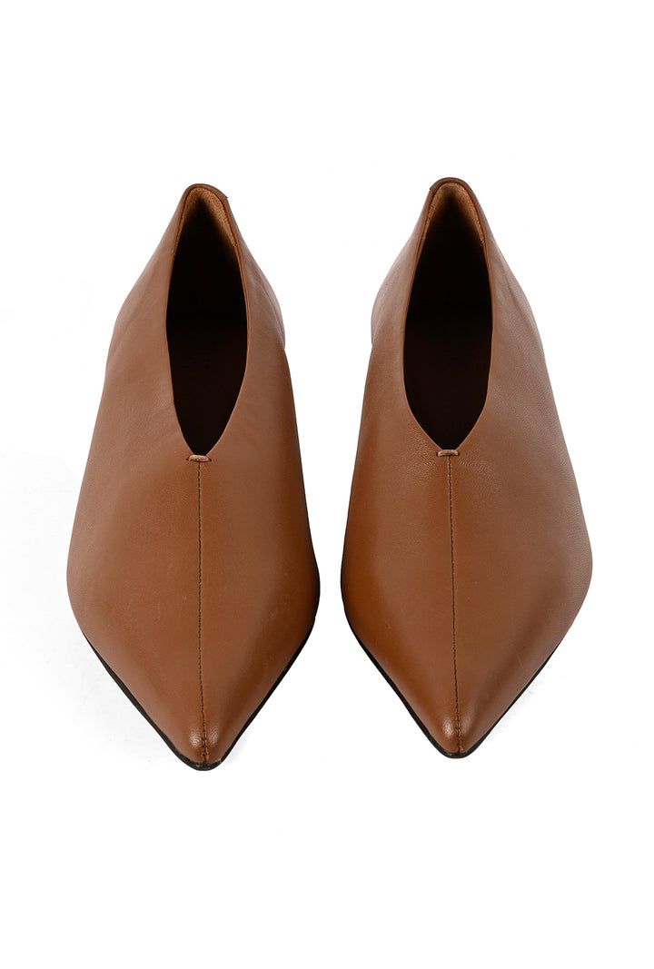 Clean, sharp, and quietly confident. This pointed closed-toe biscuit coloured court shoe is set on a kitten heel, detailed with a central seam for subtle definition. Finished with a leather sole, it’s signature JVAM style with modern restraint.