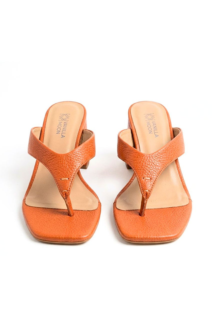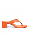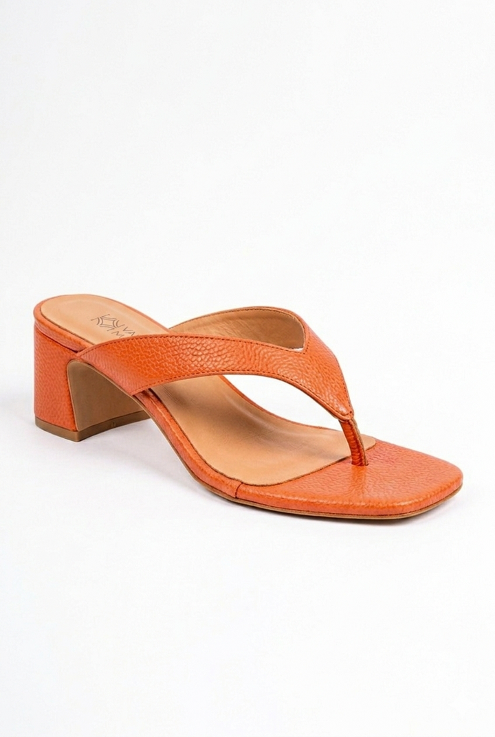 Sleek, refined and ready for anything! These peach slip-on sandals feature a grainy leather toepost, a gentle square toe, and a slim flared heel, combining clean curves with subtle elegance.