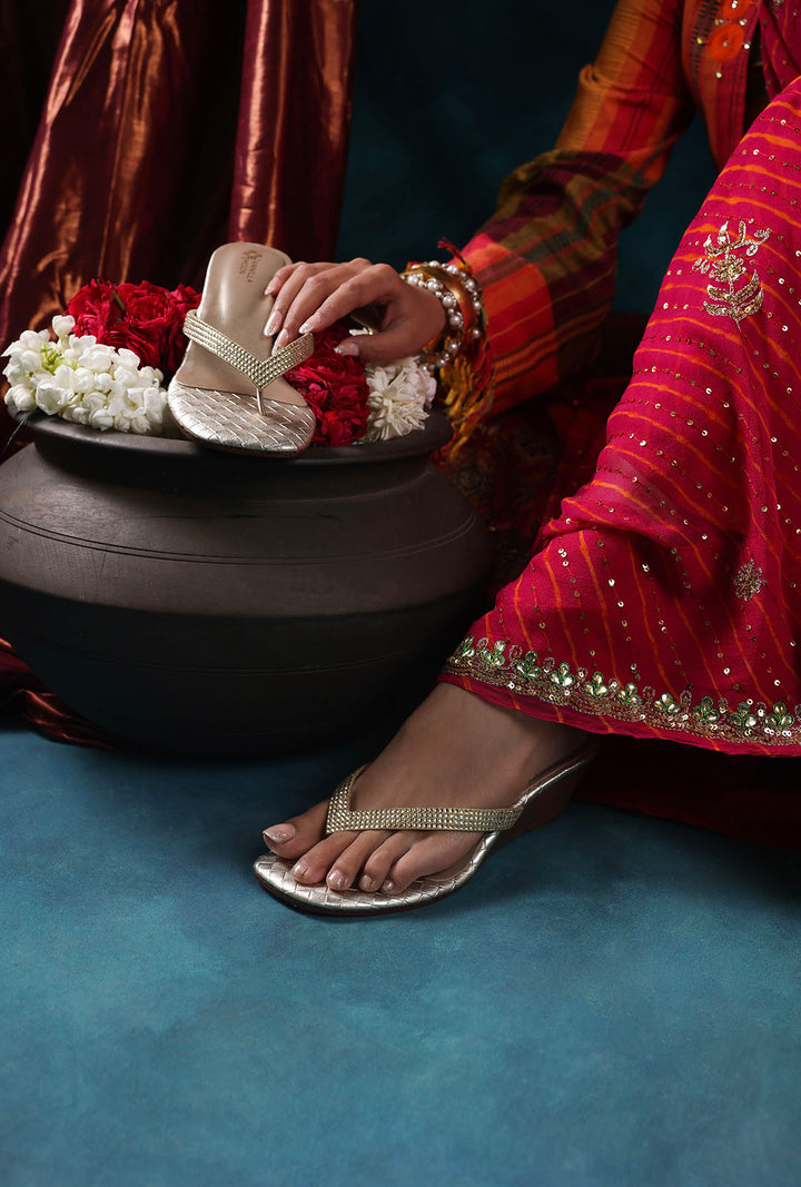 A little wedge, a lot of sparkle. These small gold crystal toe-post wedges feature a delicate criss-cross weave at the toe, set on a chic wooden wedge for just the right lift. Effortlessly dressy, endlessly wearable.
