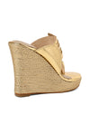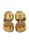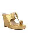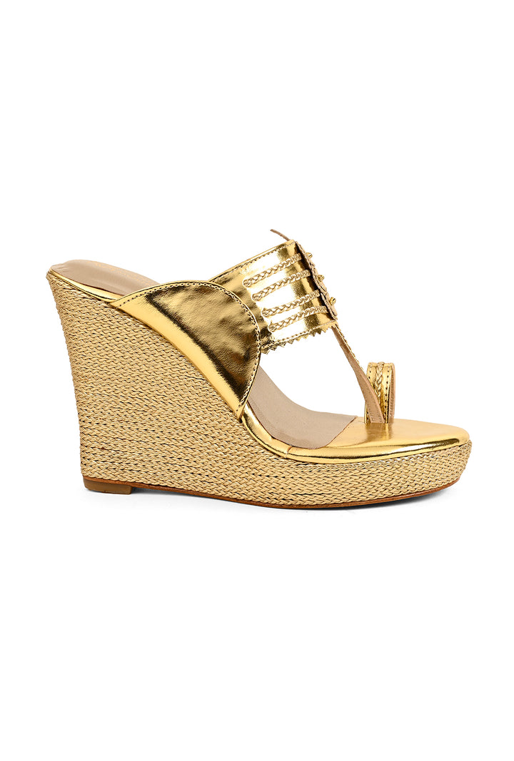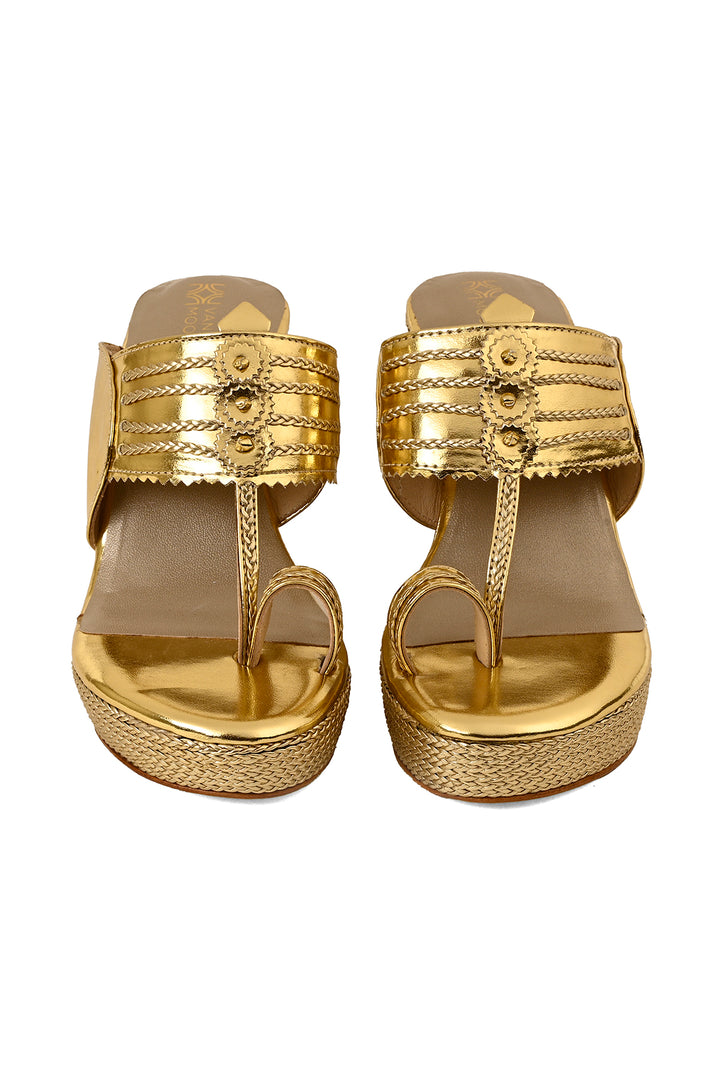 Where tradition meets high glamour. These kolhapuri-inspired high platform toe-ring wedges shine in metallic gold with finely braided wedge detailing. Lightweight yet powerful, with a cushioned leather sole for comfort, they deliver festive sparkle and luxe elegance in one beautiful pair!