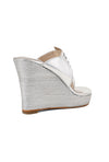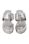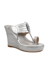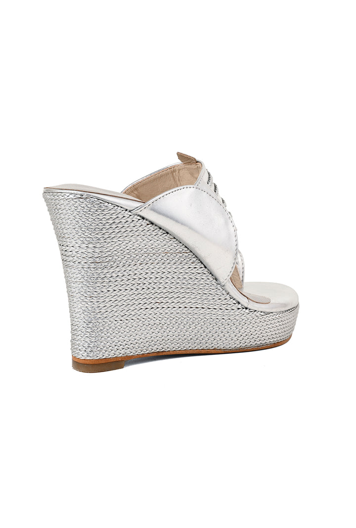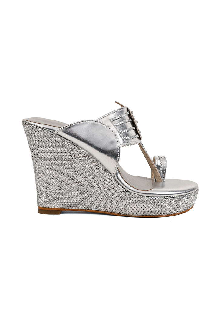 Where tradition meets high glamour. These kolhapuri-inspired high platform toe-ring wedges shine in metallic silver with finely braided wedge detailing. Lightweight yet powerful, with a cushioned leather sole for comfort, they deliver festive sparkle and luxe elegance in one beautiful pair!