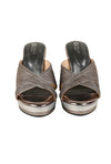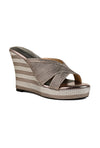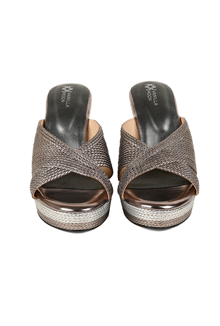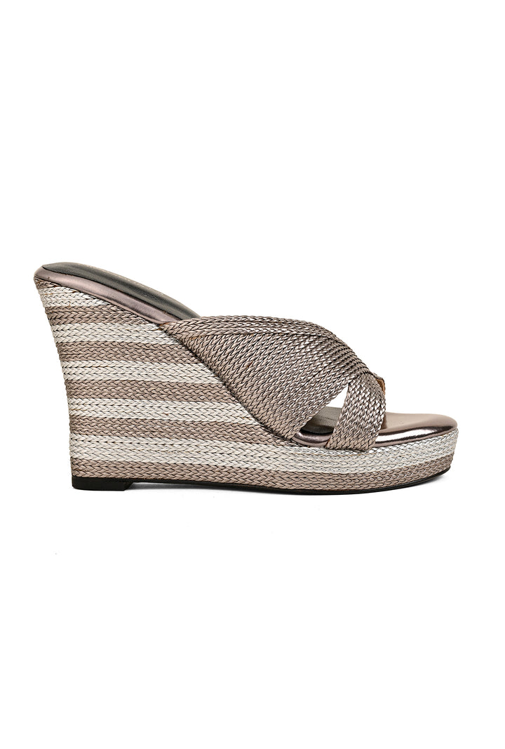 Rise and shine in subtle shimmer. These pewter and silver two-tone braided platform wedges are lightweight yet sturdy, with woven criss-cross uppers and a tall wedge that feels as good as it looks. Finished with a leather sole for all-day polish.