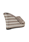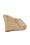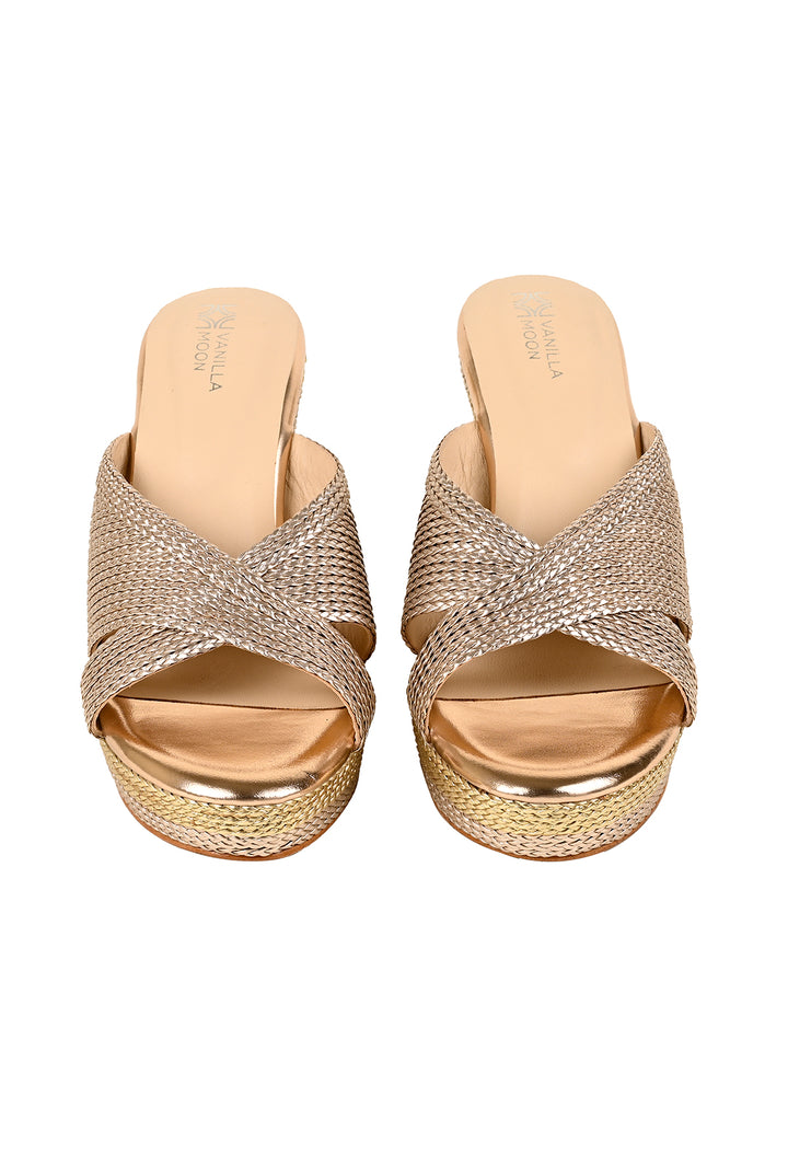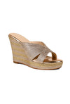 Rise and shine in subtle shimmer. These champagne and gold two-tone braided platform wedges are lightweight yet sturdy, with woven criss-cross uppers and a tall wedge that feels as good as it looks. Finished with a leather sole for all-day polish.
