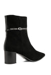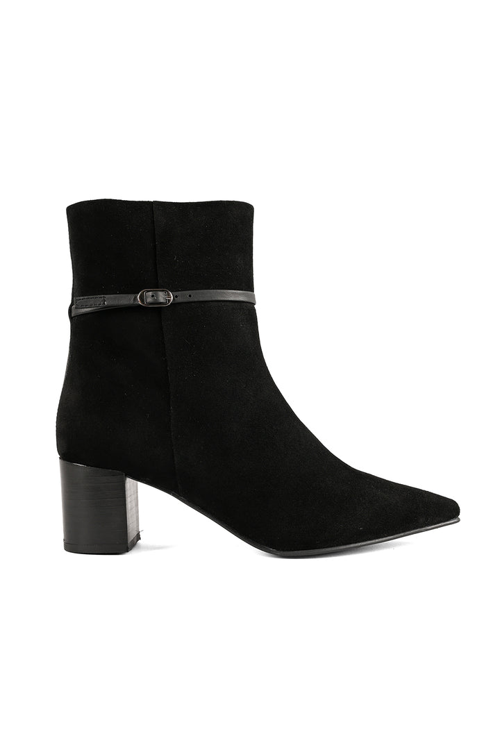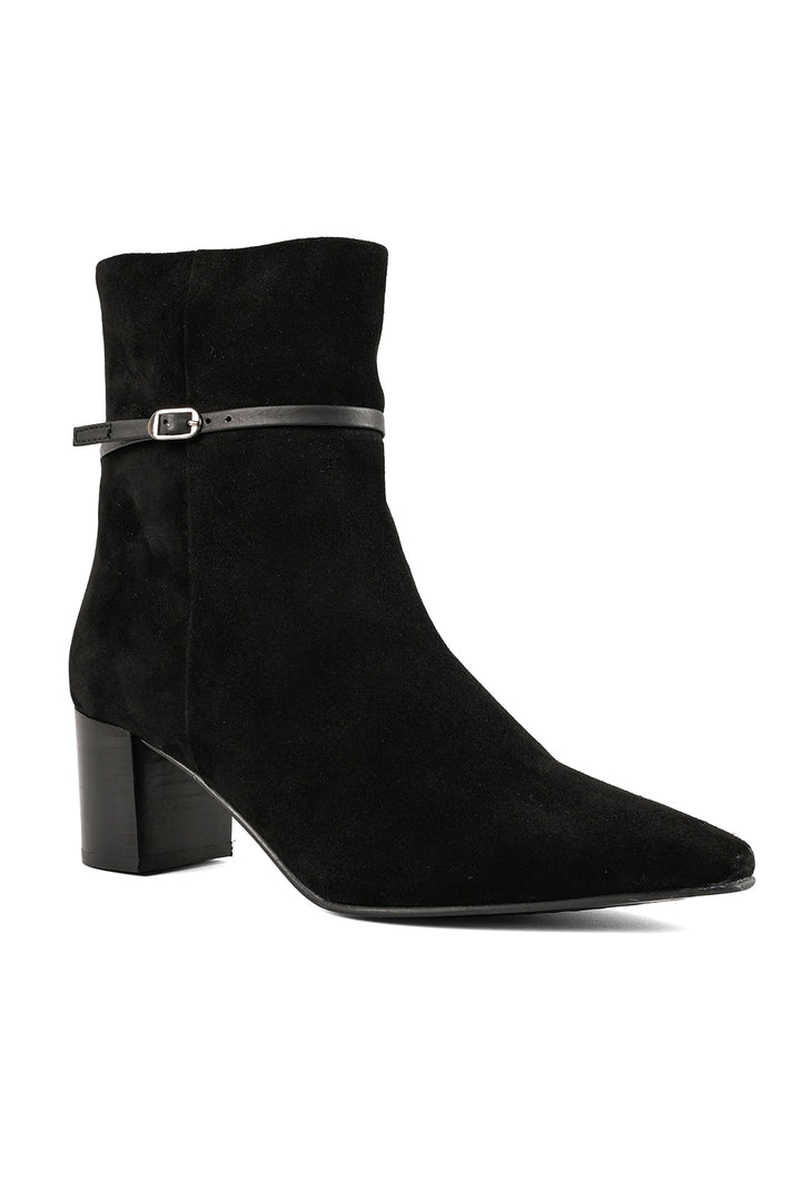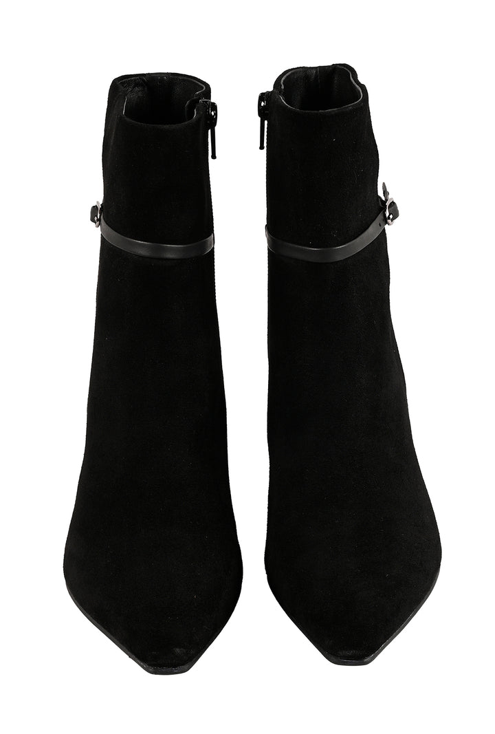 Velvet-smooth sophistication. This high ankle boot in rich black suede is elevated with a slender leather strap and a gleaming gunmetal buckle, adding just the right touch of polish. Set on a gently rounded block heel, it brings together refined craftsmanship and timeless elegance, perfect for evenings that call for understated luxury.