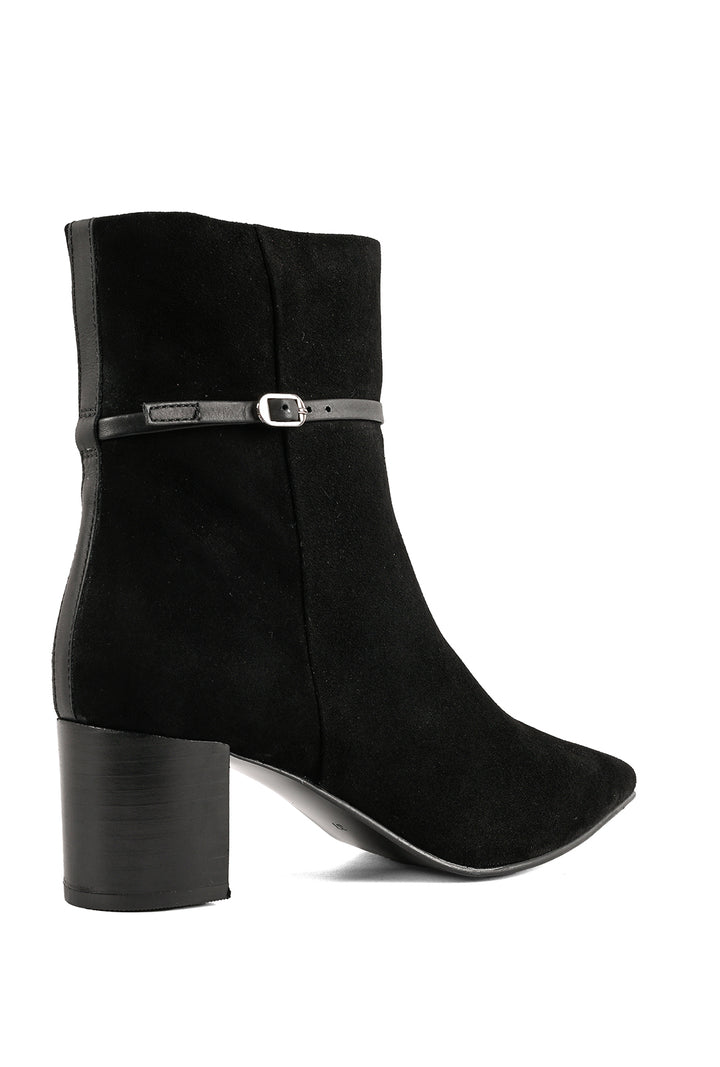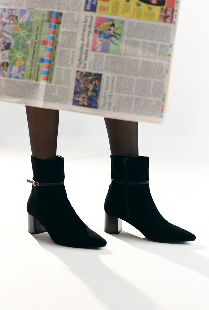 Velvet-smooth sophistication. This high ankle boot in rich suede is elevated with a slender leather strap and a gleaming buckle, adding just the right touch of polish. Set on a gently rounded block heel, it brings together refined craftsmanship and timeless elegance, perfect for evenings that call for understated luxury.