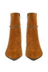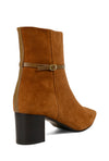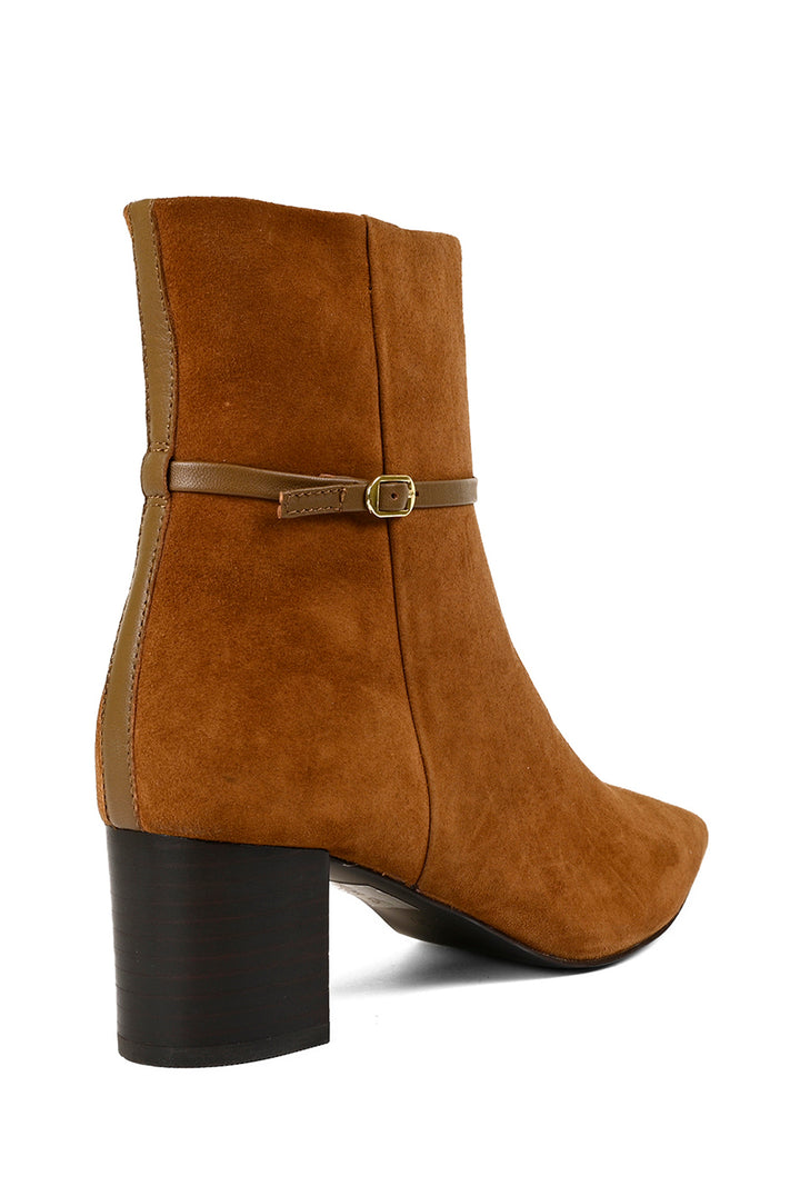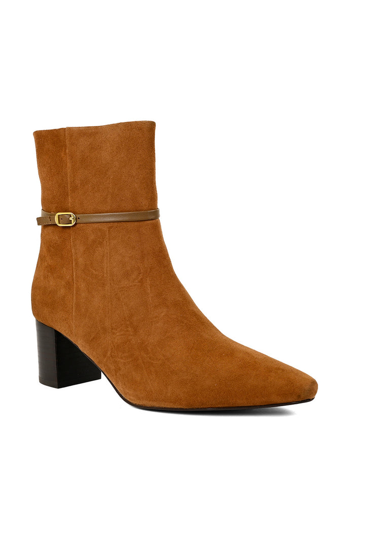 Velvet-smooth sophistication. This high ankle boot in rich tan suede is elevated with a slender leather strap and a gleaming gold buckle, adding just the right touch of polish. Set on a gently rounded block heel, it brings together refined craftsmanship and timeless elegance, perfect for evenings that call for understated luxury.