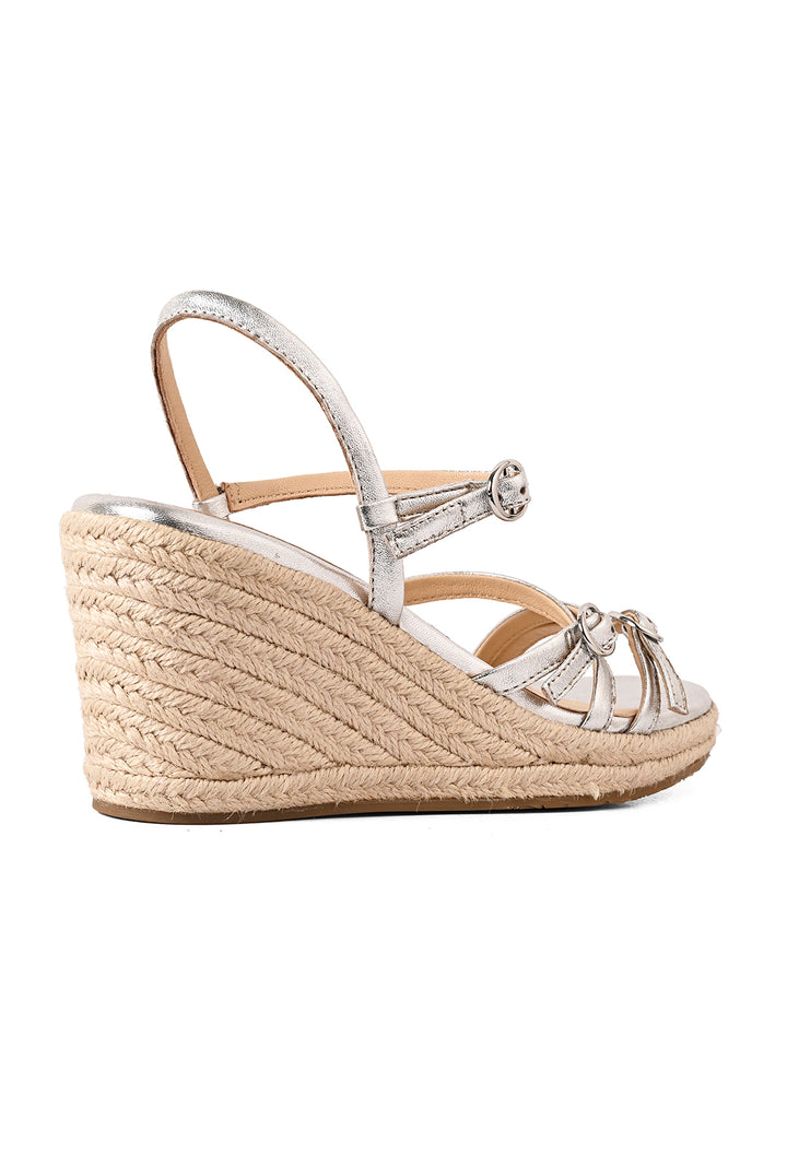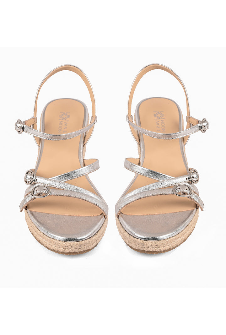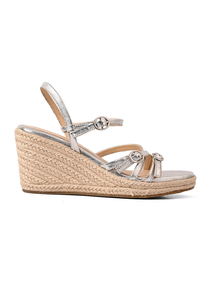Shine with subtle elegance. These silver round-toe espadrille wedges feature metallic leather and delicate thin upper straps, finished with a silver buckle and an ankle strap for added support. An anti-skid rubber sole keeps every step secure and comfortable.