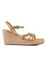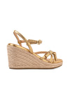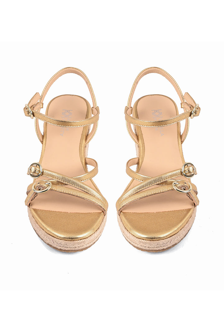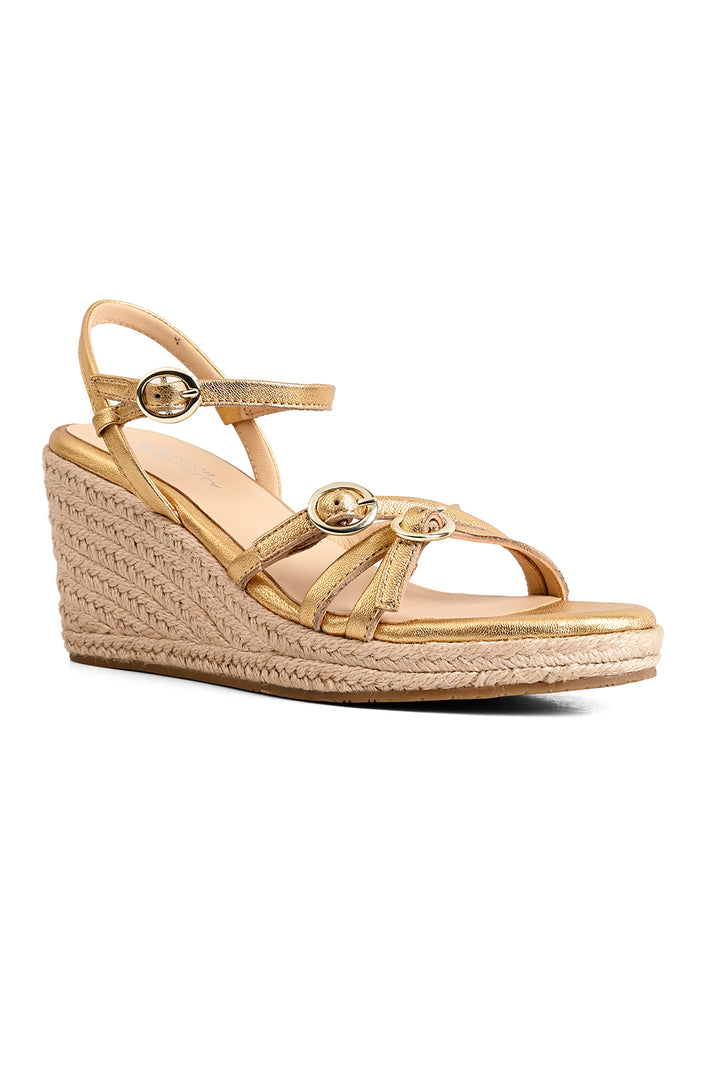 Shine with subtle elegance. These gold round-toe espadrille wedges feature metallic leather and delicate thin upper straps, finished with a gold buckle and an ankle strap for added support. An anti-skid rubber sole keeps every step secure and comfortable.