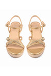 Shine with subtle elegance. These gold & silver round-toe espadrille wedges feature metallic leather and delicate thin upper straps, finished with a gold buckle and an ankle strap for added support. An anti-skid rubber sole keeps every step secure and comfortable.