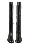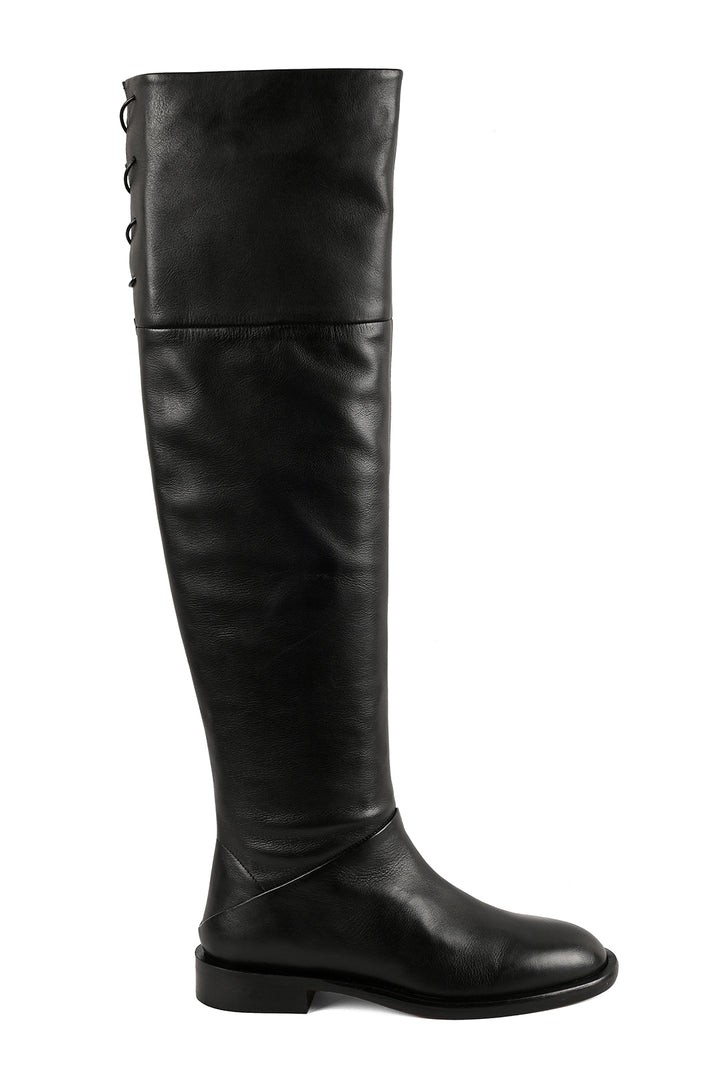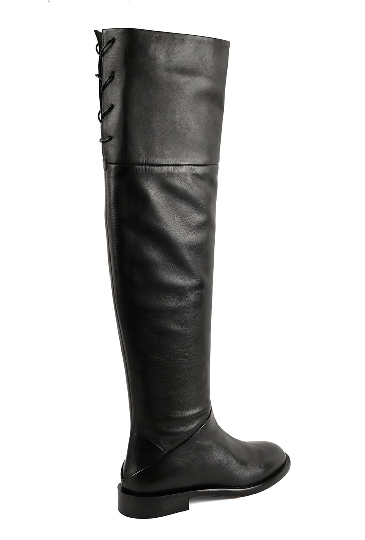 These flat, black over-the-knee boots feature a rounded toe and a leather lace at the back of the calf for a subtle, adjustable fit. Finished with an anti-skid inserted rubber leather sole, they combine style and practicality for a modern, elevated wardrobe staple.