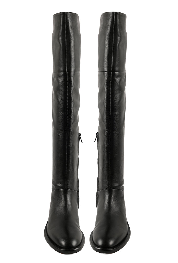 These flat, black over-the-knee boots feature a rounded toe and a leather lace at the back of the calf for a subtle, adjustable fit. Finished with an anti-skid inserted rubber leather sole, they combine style and practicality for a modern, elevated wardrobe staple. By JVAM.