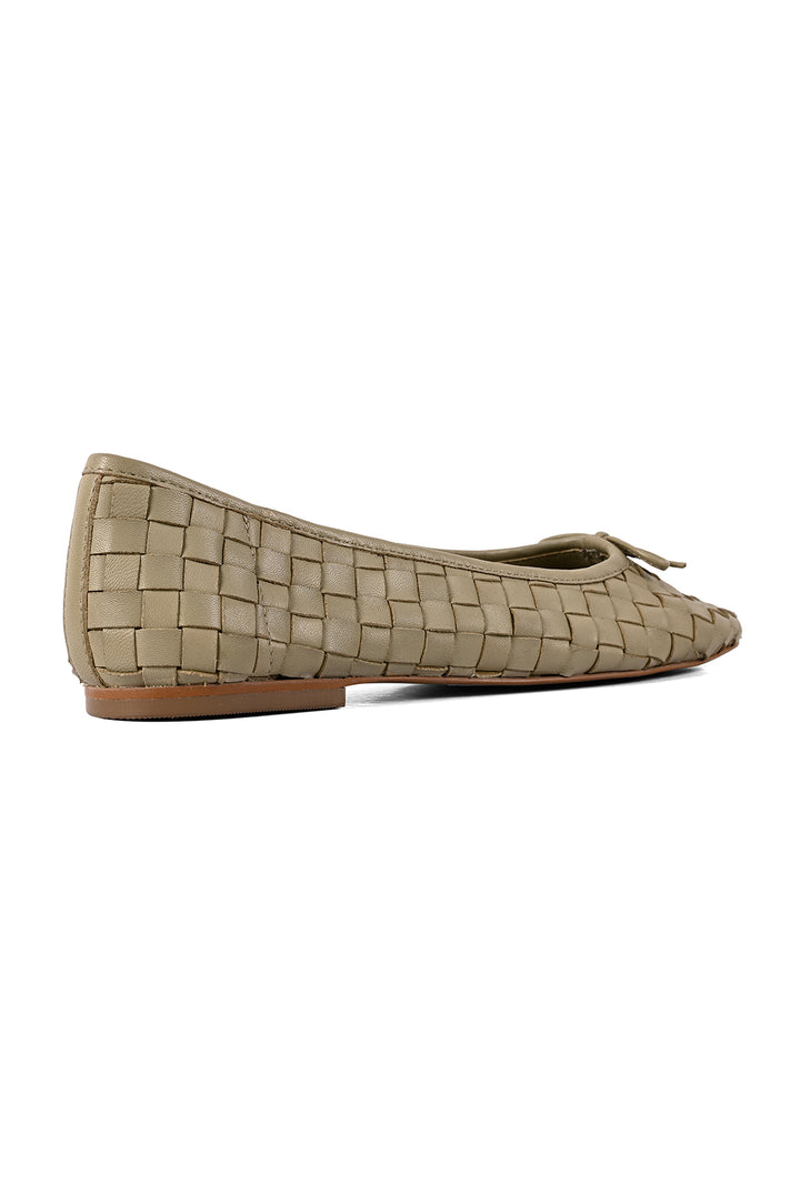 Delicate and effortlessly charming. This woven ballerina features a rounded toe and a subtle bow detail in pistachio green, blending texture and soft femininity for an understated, versatile look.