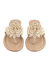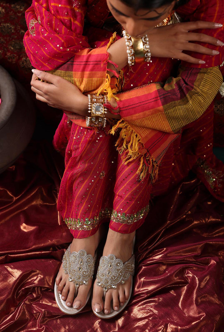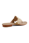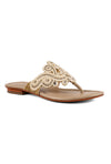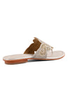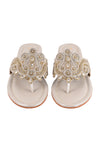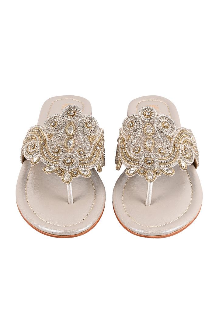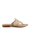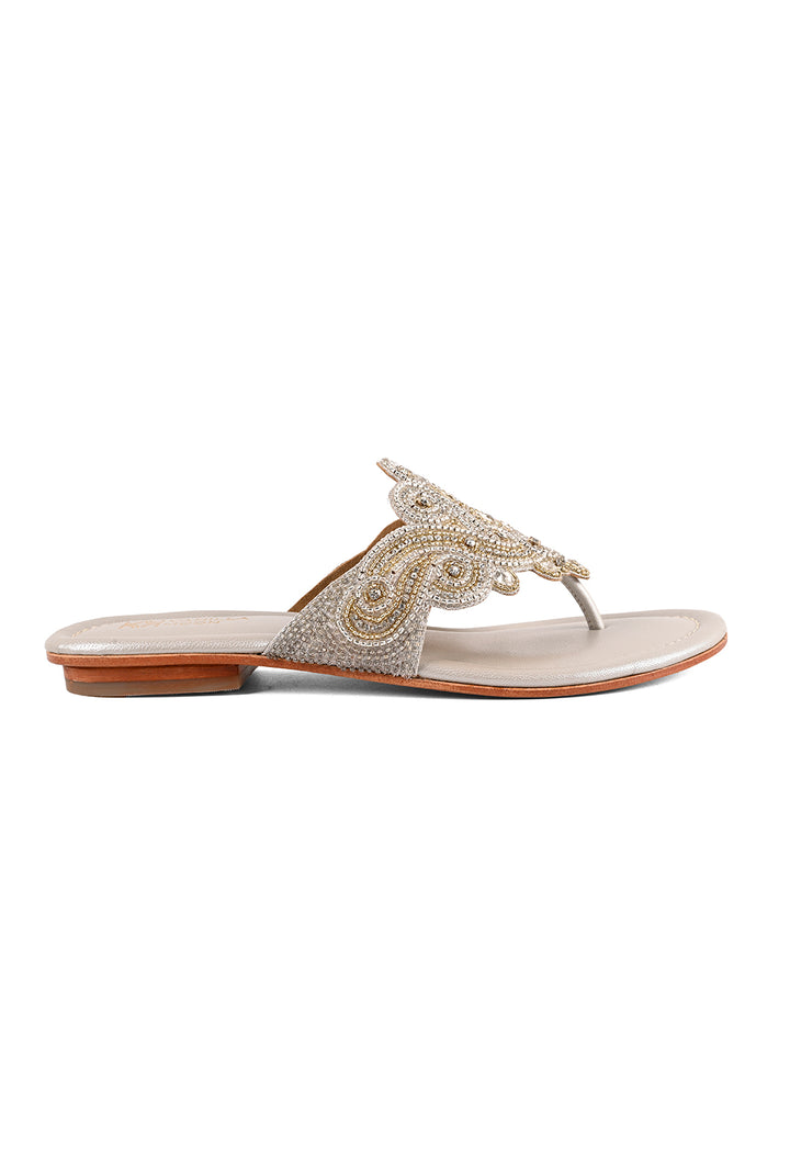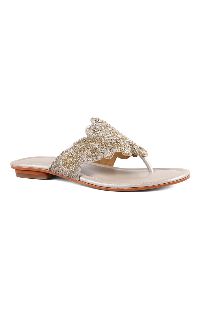 These gold flats shimmer in a classic champagne tone, detailed with hand embroidery of silver beads and crystals for a look that’s timeless and radiant. Designed with a refined toe-post, a smooth leather sole, and a softly padded insole with tonal stitching, they balance elegance with all-day comfort.